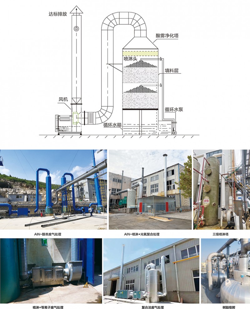 廢氣凈化噴淋塔主要的運作方式是廢氣由風管引入凈化塔,經過填料層,廢氣與氫氧化鈉吸收液進行氣液兩相充分接觸吸收中和反應,廢氣經過凈化后,再經除霧板脫水除霧后由風機排入大氣。吸收液在塔底經水泵增壓后在塔頂噴淋而下,回流至塔底循環使用。凈化后的廢氣達到地方排放標準的排放要求,低于國家排放標準。